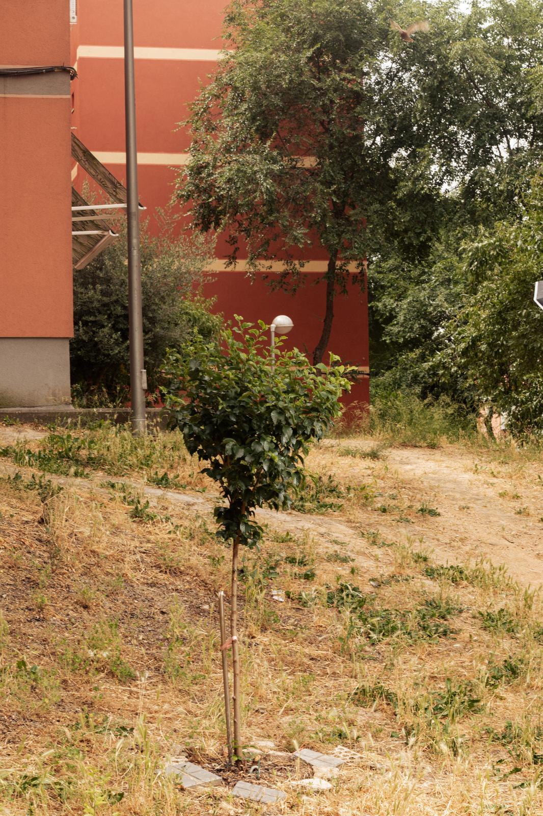 Con riegos y cuidados ha sacado adelante una pequeña olmeda que ha salvado de la tala municipal, así como otros arbolitos de la misma especie que aparecen entutorados por los taludes que jalonan el paso por los interblques del barrio de Vinateros.